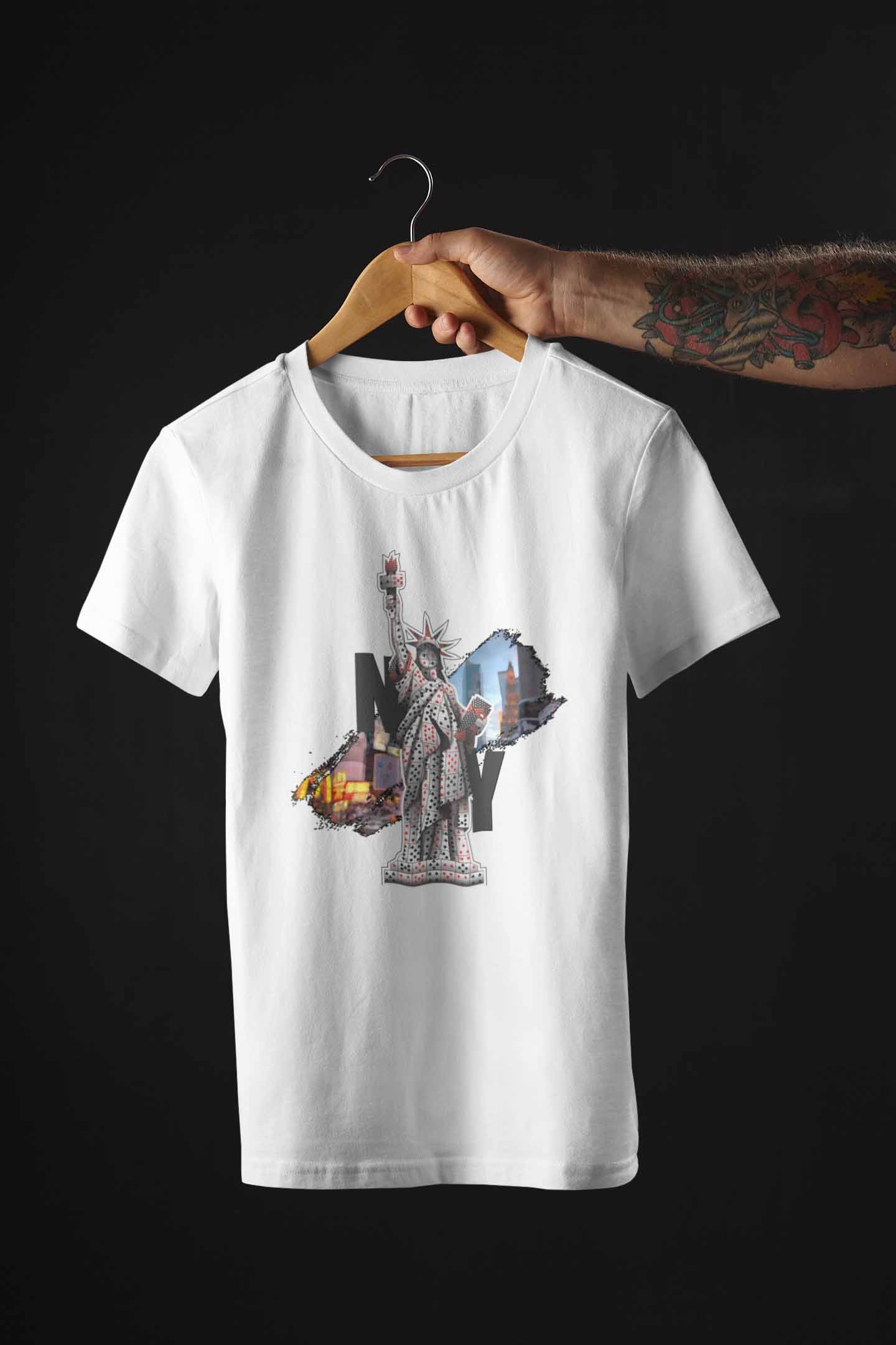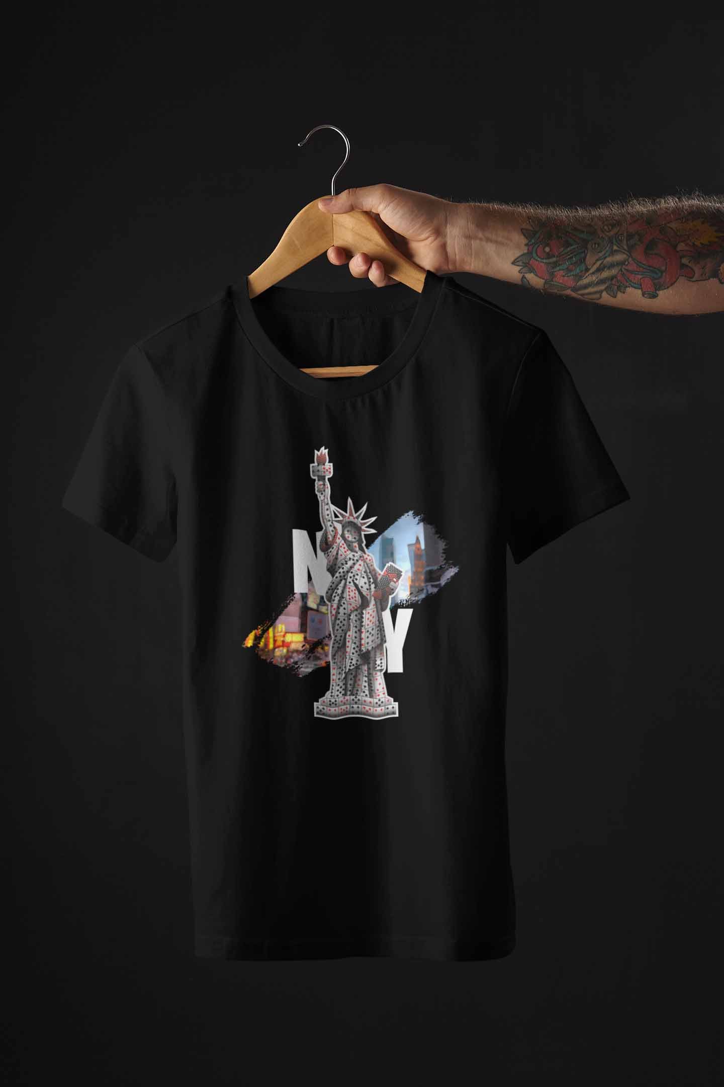 Uma peça que une atitude, arte e urban style. A estampa traz a icônica Estátua da Liberdade construída inteiramente com cartas de baralho, em contraste com recortes da cidade de Nova York ao fundo.
